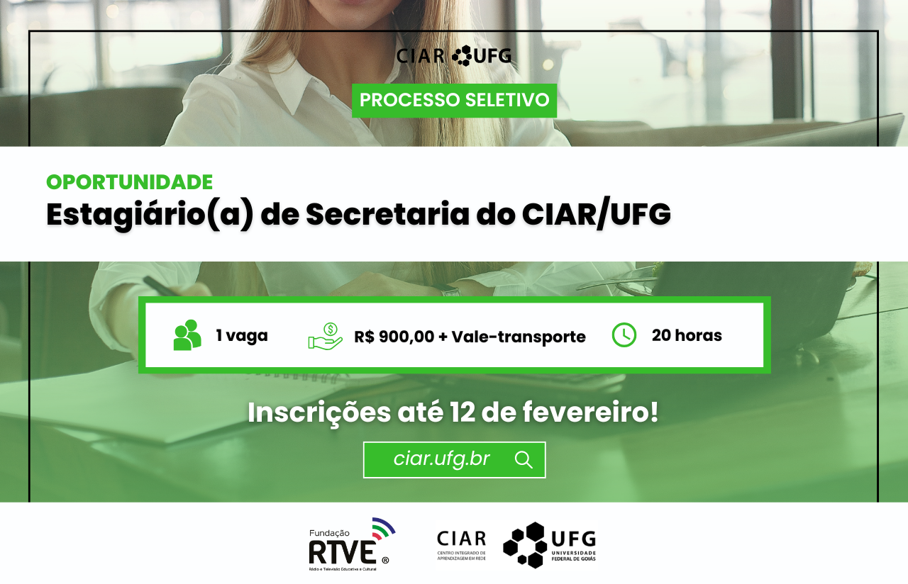 O CIAR está selecionando, por meio da Fundação RTVE, uma(a) estagiário(a) para compor a equipe de secretaria do órgão. As inscrições para a única vaga, com carga horária de 20 horas semanais, vão até dia 12 de fevereiro. Estudantes da Faculdade de Ciências Econômicas e Administração (FACE/UFG) e da Faculdade de Letras (FL/UFG) cursando a partir do 3º período podem se inscrever.